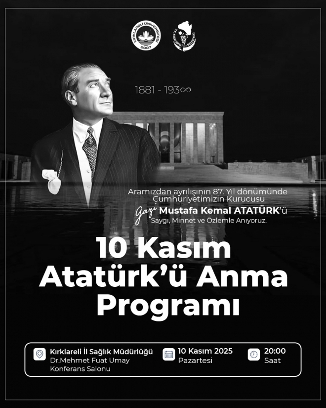 Program, Kırklareli İl Sağlık Müdürlüğü Dr. Mehmet Fuat Umay Konferans Salonu’nda, 10 Kasım 2025 Pazartesi günü saat 20.00’de gerçekleştirilecektir.